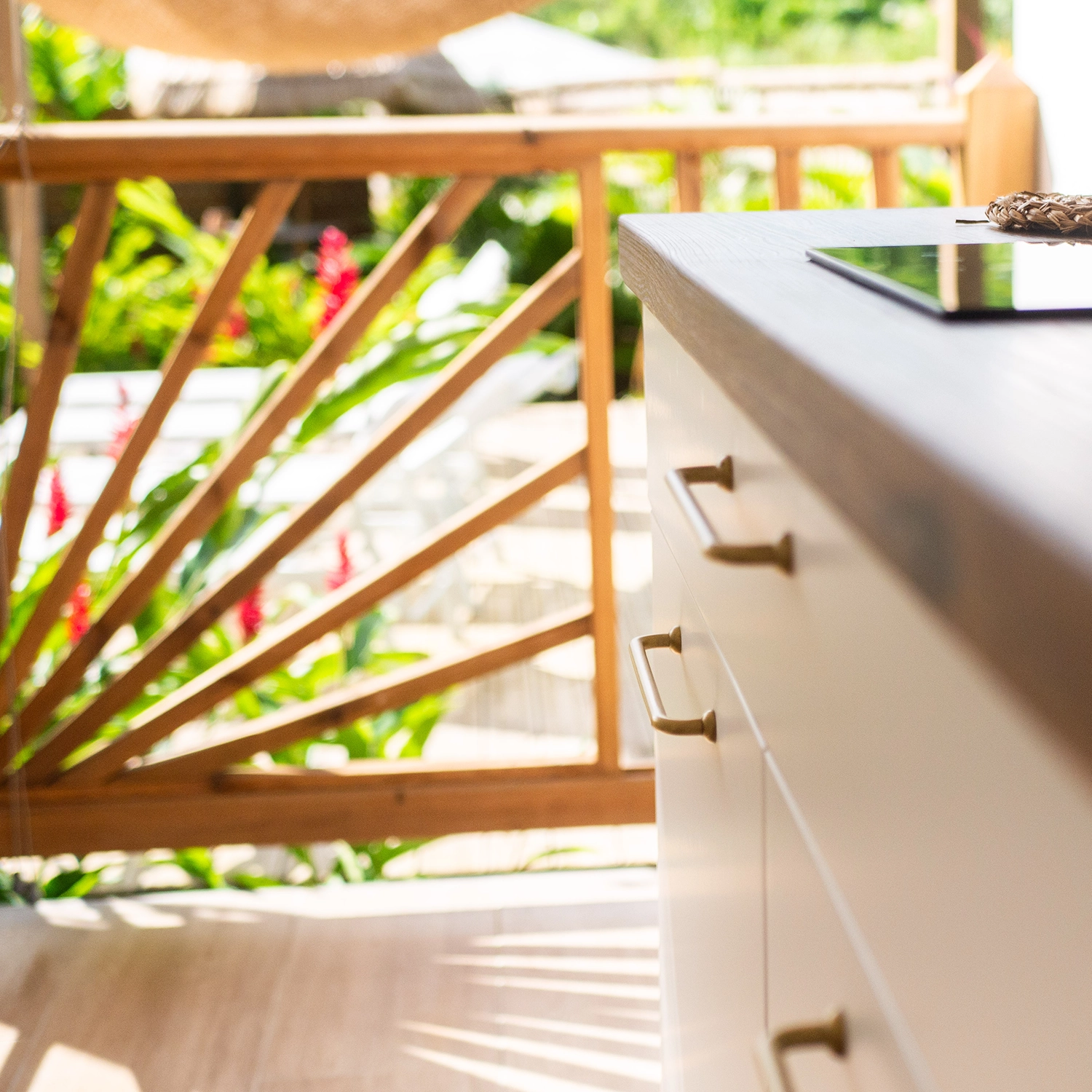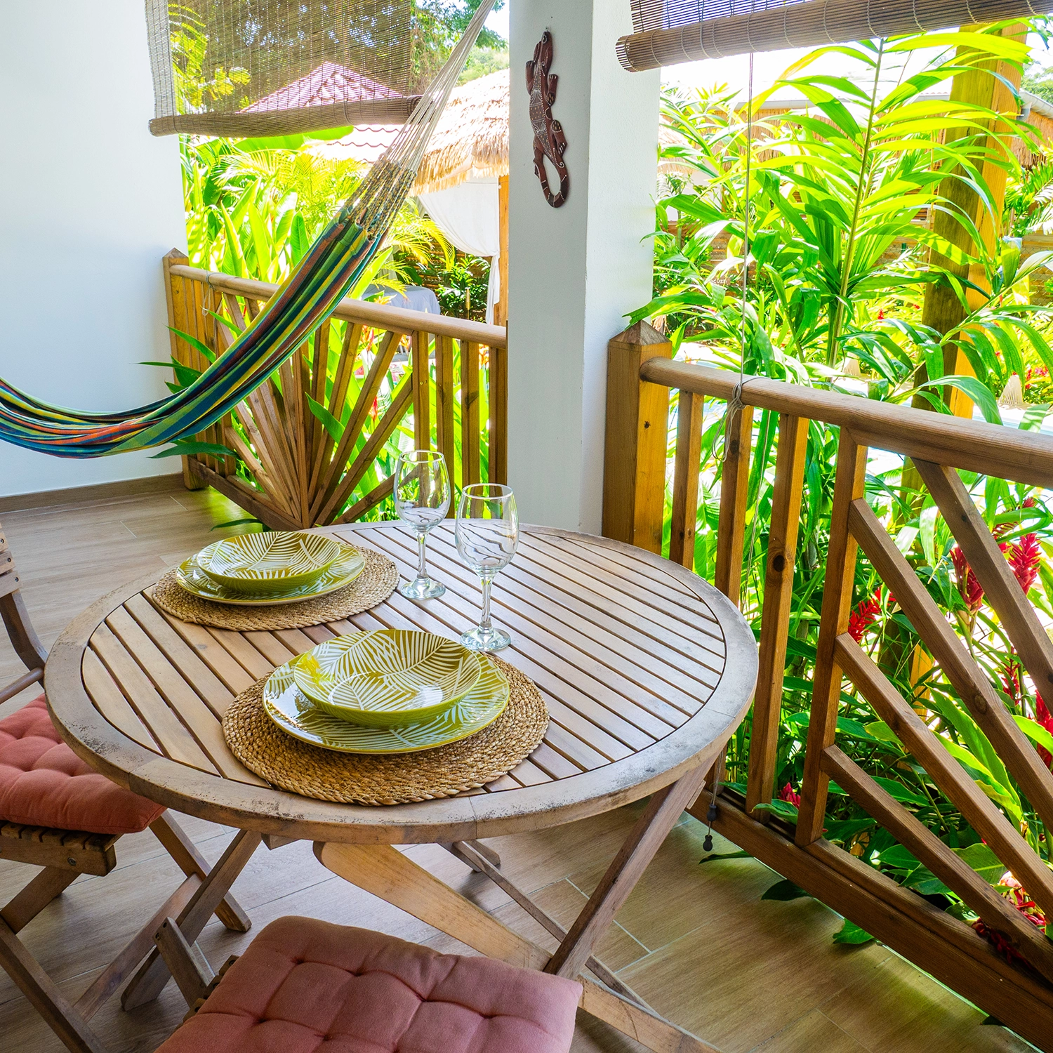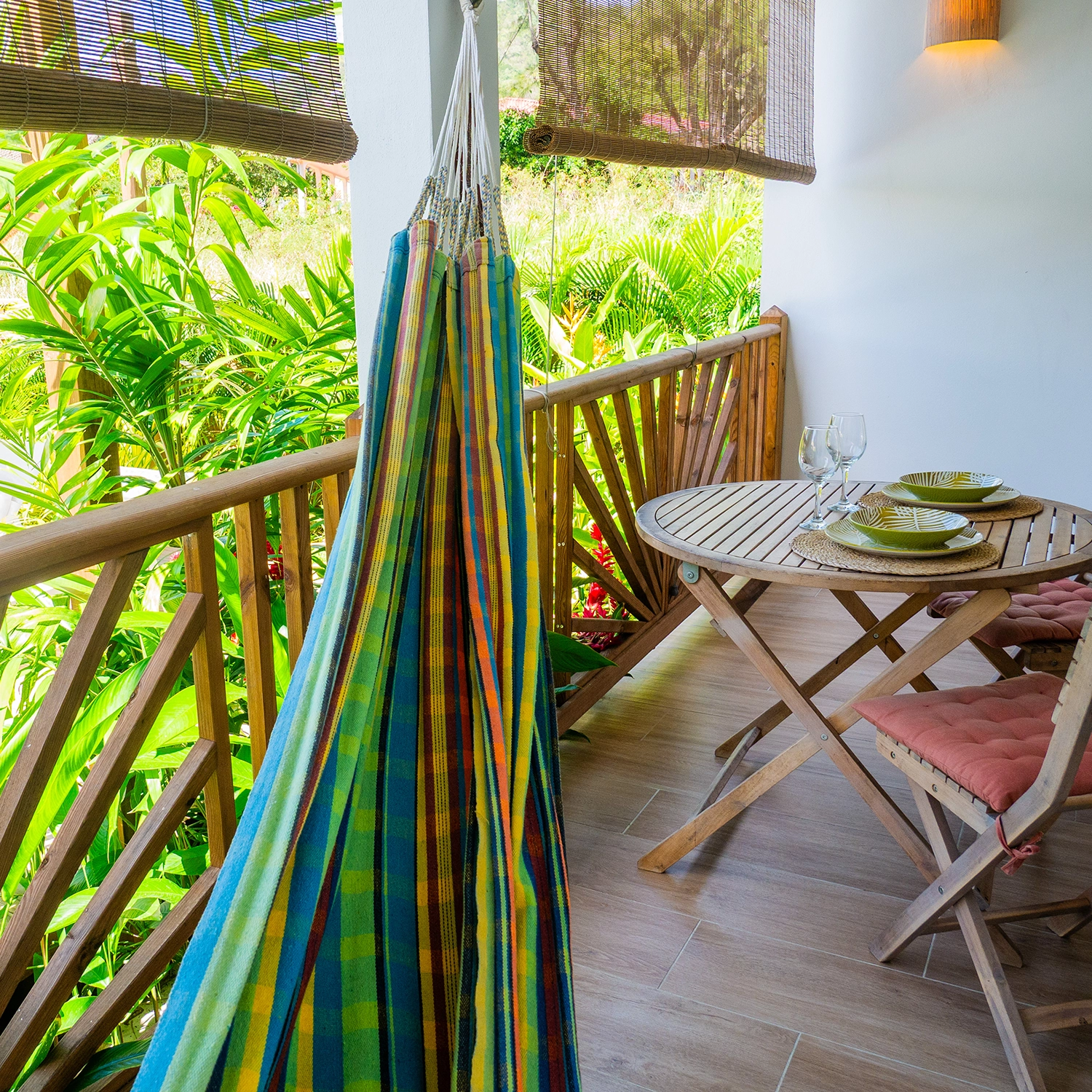 La kaz Papaye, tout confort, de 20m2 (intérieur) pour 2 personnes est agrémentée d’une belle terrasse privée vue piscine et jardin.